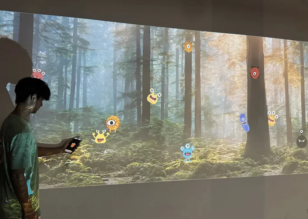 C② AIoT擬人小怪物 小朋友手伸入「掌心怪獸生成盒」,AI會生成可愛特別的「擬人化小怪物」;小朋友拿著裝有APP的手機,走到夜森林影像前搖搖手機,喚醒自己創造的小怪獸並與之互動,也可把小怪物撈回家。